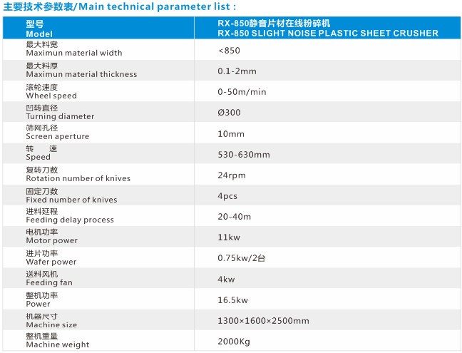 配有鼓风机,粉碎后的碎片可直接输送到片材机循环使用。(需另外配备储料桶及不锈钢管路)